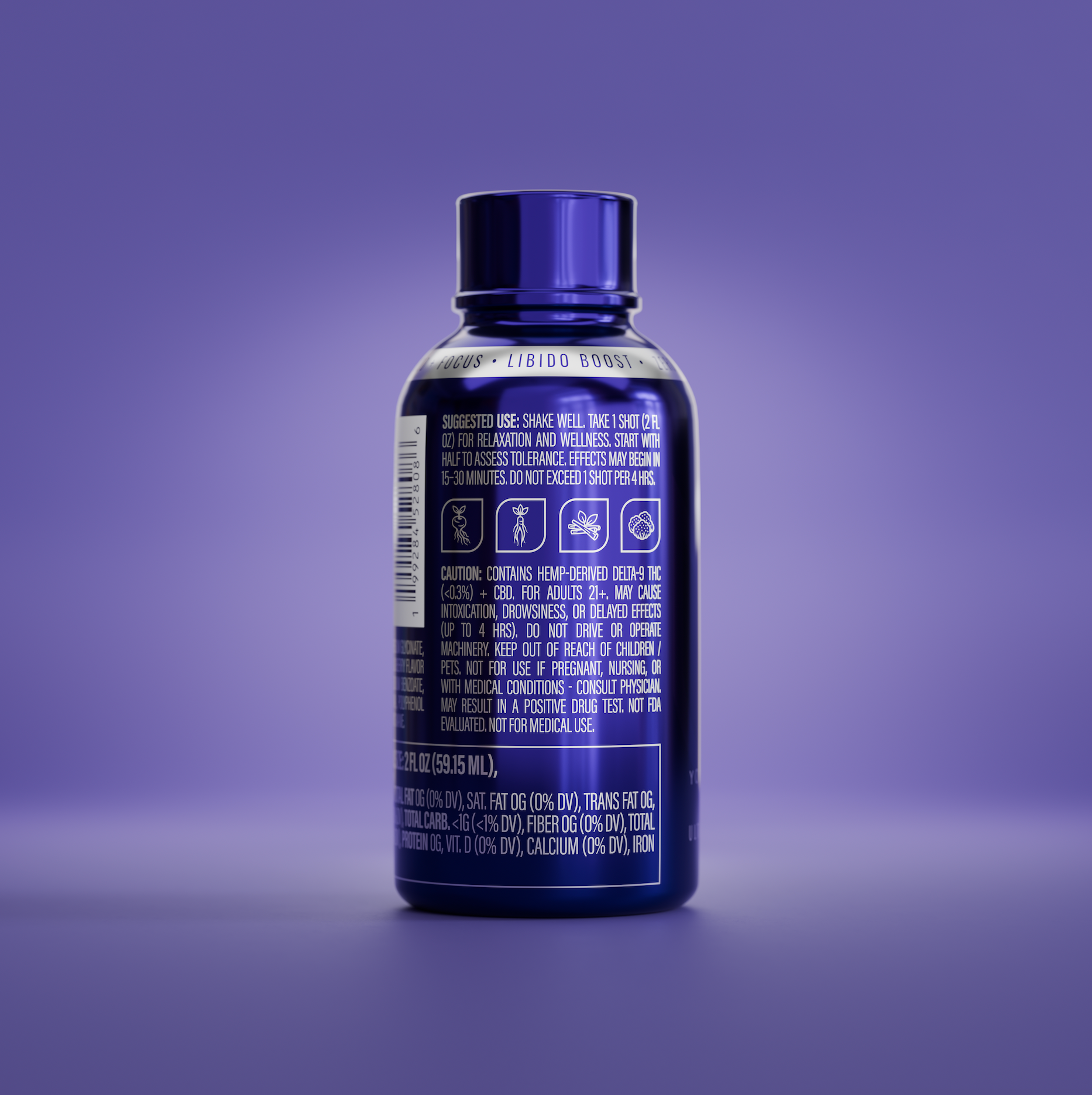 - Potency per 2oz shot: 5mg hemp-derived THC + 2mg CBD